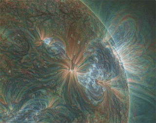 EFRs interact with pre-existing magnetic fields in the corona and produce small flares (plasma heating) and collimated plasma jets. The GIF below show multiple energetic jets in three different wavelengths. The light has been colorized in red, green and blue, corresponding to three coronal temperature regimes ranging from ~0.8Mk to 2MK.